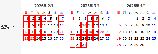 - 試験日:受験可能日は、上のカレンダーの赤枠の日程です。